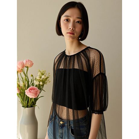 繊細なドットがやさしい印象を醸し出すチュールギャザーブラウス