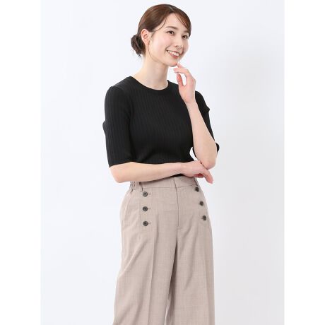 綺麗目からカジュアルまでオンオフ兼用で着回せる、半袖のニットプルオーバーです。すっきり見えるリブ編みがポイント。Tシャツのように着れる手軽さと上品なルックスを兼ね備えた一枚です。