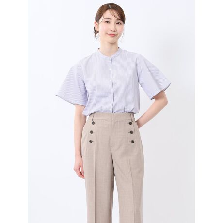 シンプルで使いやすいスタンドカラーの半袖シャツです。ストライプ柄で清潔感があります。胸元のパール調のボタンがアクセントになっています。