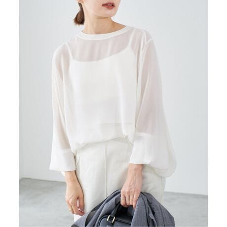 シアーな素材にリブネックが新鮮なシフォンブラウス。