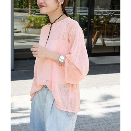 和紙原料のドライタッチのシアー感ある軽いニットで夏でも肌離れよく吸湿速乾性もあります。