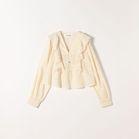 大きめのフリルにギャザーが盛り込まれた華やかな一枚。