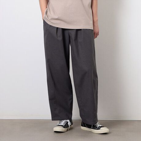 定番人気のワイドテーパードデニムパンツを夏に向けて麻混素材でつくっています。