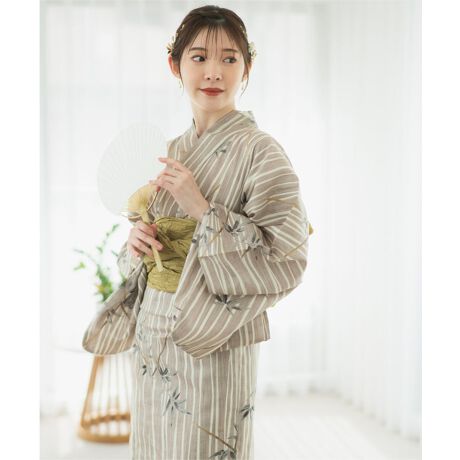 グレージュのストライプの地に凛とした竹の姿が描かれた浴衣。