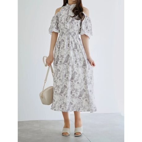 程よい肌見せがレディな上品花柄バルーンスリーブワンピース