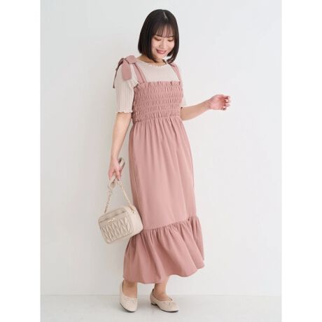肩リボンと裾フレアがキュートさを演出する?シャーリングロングワンピース
