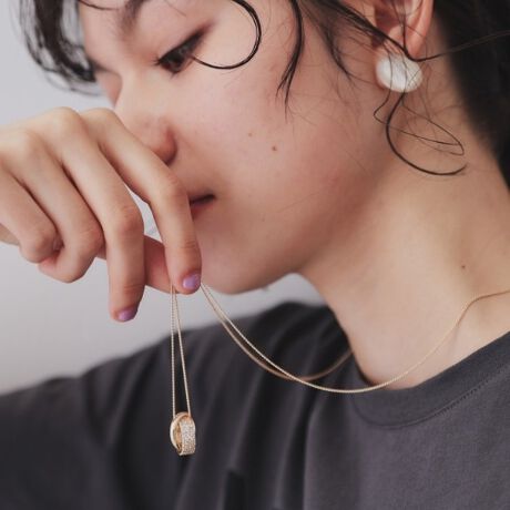 美しいキルトパターンにビジューをあしらったリングネックレスは、目を引く存在感を放ちます。