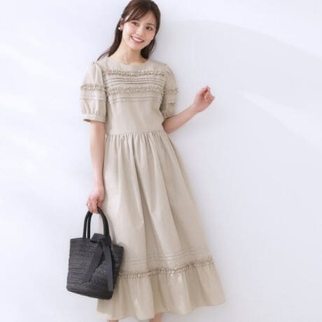レーザーカットした共生地のプチフリルとタックのディテールが効いたLADYなワンピース。