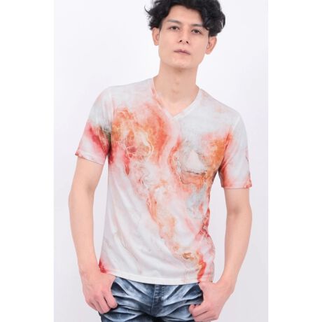 海の波をモチーフにしたマーブル柄を、大胆かつダイナミックにレイアウトしたフルグラフィックVネックTシャツ。