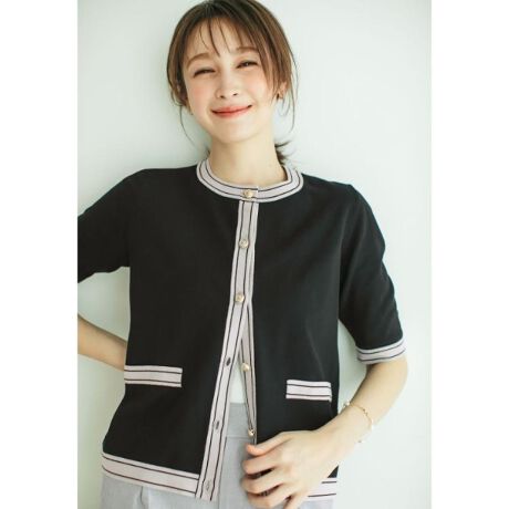 ・目面の綺麗なオーガニックコットンを使用したバイカラーラインと金釦がミニマルな半袖カーディガン。