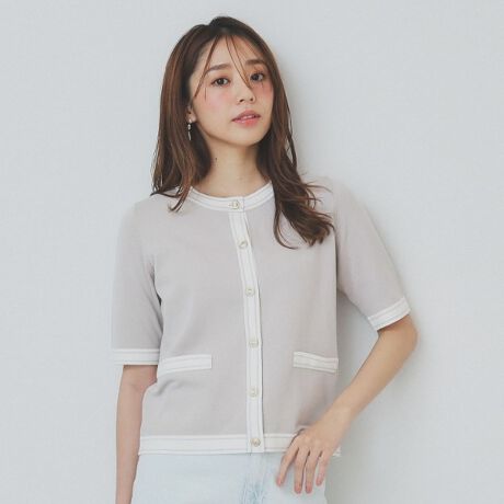 ・目面の綺麗なオーガニックコットンを使用したバイカラーラインと金釦がミニマルな半袖カーディガン。