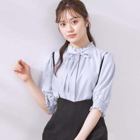 【5分袖・通勤】リボンタイ付きピコフリル5分袖ブラウス