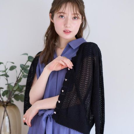 【冷房対策・通勤】透かし編みシャイニーニットカーディガン