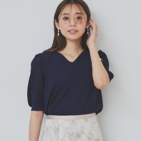 Vネックのあき具合もちょうどよくて、袖のデザインも夏にも着られる涼しげなニットです。