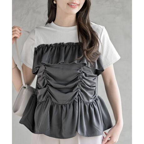 白Tシャツにビスチェを重ねたようなドッキングトップス。