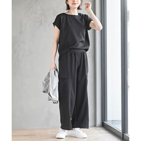 Tシャツとパンツのきれいめカジュアルなセットアップ。
