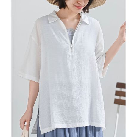 コーデのアクセントにもなるハーフジップブラウス