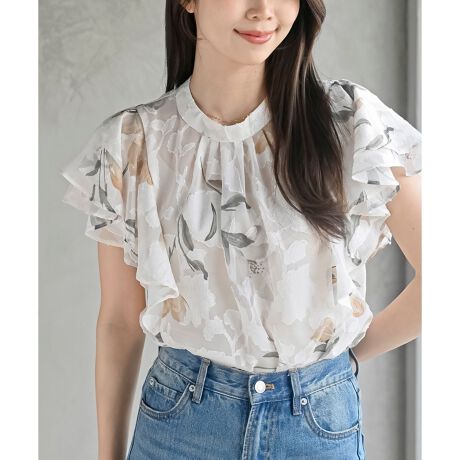 優しいニュアンスのフラワープリントが上品な装いを演出するブラウス。