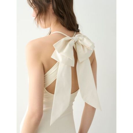 大胆なオープンデザインのバックスタイルに、トッピングされたリボンがとびきりキュートなボディスーツ。カップ付きなので一枚でさらりと着用でき、フロントはトレンド感溢れるアメリカンスリーブですっきりと仕上げました。身頃には程よいストレッチのある天竺を使用し、肌触りの良い素材感で快適な着心地を提供。バックスタイルのリボンにはハリ感のあるタフタ素材を使用し、メリハリを効かせています。アイボリーとブラックの2色をご用意しました。