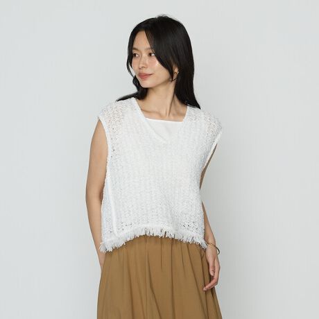 すとんとしたボックスシルエットで夏らしい清涼感あるイメージのサマーツィードニットジレです。