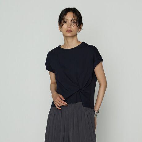 フレンチスリーブの袖口は花びらのように重ねた仕様でフェミニンさをプラスしています。