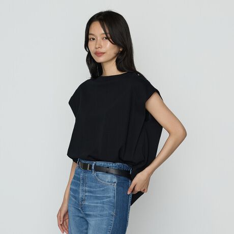 大胆なショルダータック、二の腕にも少しかかるくらいの程良いワイド感がモードです。