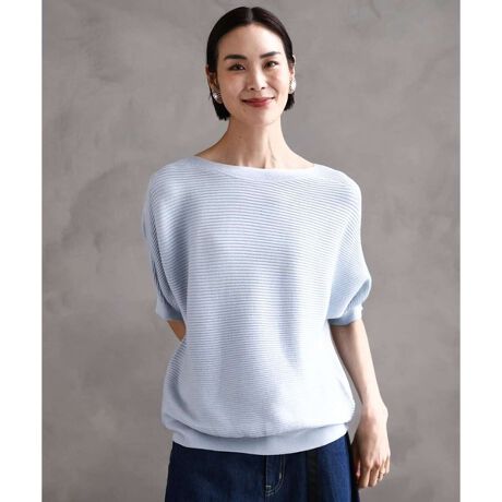 リブの横使いのボートネックのドルマンスリーブプルオーバー。裾のリブをたるませて着るだけで、こなれ感が出てシルエットが様になるデザインです。