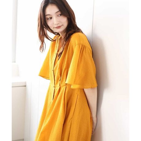 一枚で存在感のあるマキシ丈ワンピースです。ベルラインの袖が大人可愛いデザインです。袖に立体感が出るので、気になる二の腕から肘までしっかりとカバーしてくれるのも嬉しいですね。ポコポコとした凹凸のある表面感は汗ばむ時期でも快適な着心地です。サラッとした肌触りで清涼感もあります。ウエスト切り替えで腰位置が高く見えてスタイルアップ効果大です。前ボタンを開けて羽織として着回しても◎。