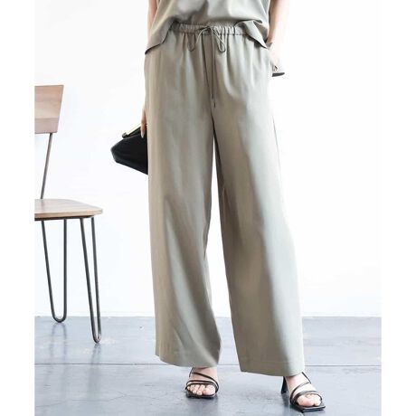 リラクシーなワイドパンツ。ゴムギャザーの着心地の良さと素材の落ち感を活かしたすっきりしたシルエットが魅力。40サイズは限定店舗展開です。