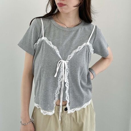 レースディテールがフェミニンな印象のビスチェと半袖カットソーのセットアイテム。