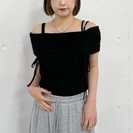 デコルテを綺麗に演出し、ドロストギャザーデザインで華奢見えが叶います。