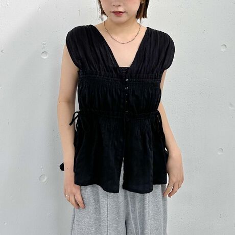 胸元のシャーリングとサイドリボンでスタイルアップ◎