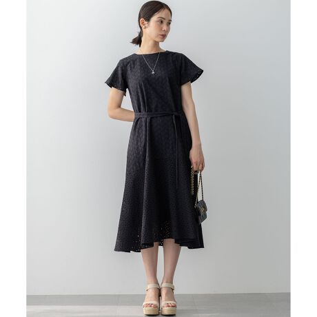 ■デザインフラワーモチーフレースをベースに裾切り替え下は幾何柄レースを使用しました。裾にかけてしなやかに広がる Aラインシルエットが美しいワンピースです。袖はセットインの切り替えフレアスリーブです。着丈に前後差をつけ、後ろはさらに裾の分量感を出すことでより女性らしさのあるシルエットに。裾にカーブをつけた切り替えを入れ、フォルムに立体感をプラスしています。透けづらいように裏地付きですが、体に沿う部分は綿ローンを使用し心地よく、胸下辺りから透けづらい裏地に切り替えることで安心して着用できるようにし、ラクチンな着心地でありながら 1枚でサマになる使い勝手抜群なワンピースに仕立てています。両サイドにポケット付き、花柄の共布リボン付き。共布リボンでウエストマークしてフィット&フレア風のスタリングも可能です。