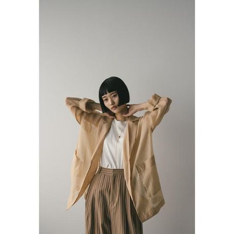 [型番:500ISS30-2531]モデル身長163cm(FREEサイズ着用)表情感のあるマットシアー素材が映えるテーラードジャケット。上品な透け感にこだわり、大人っぽく着用していただける一枚です。バランスのとりやすいビックポケットデティール仕様。デイリーシーンはじめ幅広いシーンで着用いただけます。透け感あり、ストレッチなし。【お手入れ方法】手洗い可