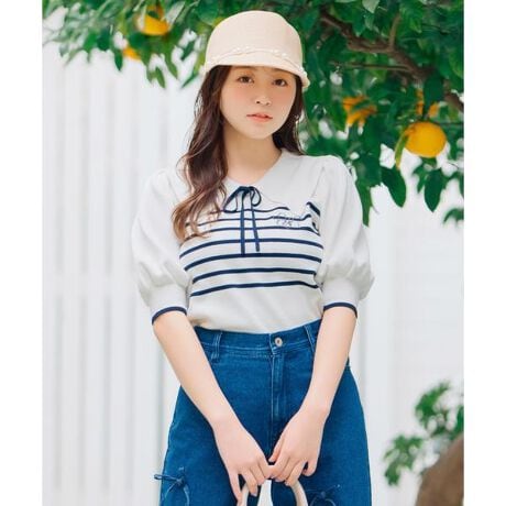 セーラーカラーのような襟デザインでマリンなムード漂うニットプルオーバー【Design】・ビッグカラーできちんと感も演出できるフェミニンニットトップス。・袖口はリブ仕立てでふんわりとしたパフスリーブに仕上げました。・二の腕がすっぽりと隠せる袖丈なのも嬉しいポイント♪・リボンタイは取り外しが可能なので気分に合わせて取り外したり、お手持ちのブローチなどを付けても◎・胸元にあしらったロゴ刺繍が高級感をプラスしてくれます!【Fabic】・軽い着心地のさらりとした生地を使用。・ご自宅でお手入れが出来るのも嬉しいポイント♪・ホワイト、レッド、ネイビーの3色展開となります。【Care】手洗い可能
