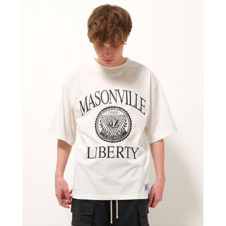 フロントにエンブレムとレタリングロゴを飾ったTシャツ。