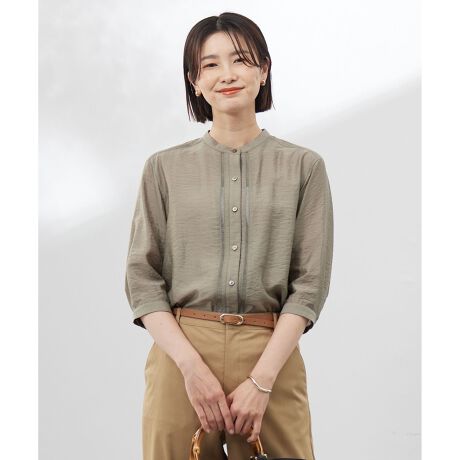 ■デザインゆとりのあるサイズ感と程よいレングス感を兼ね備えたバンドカラーブラウス。前立て両サイドに縫い込まれたシンプルなハシゴレースが、透け感が魅力のシアー素材と相まって、女性らしい軽やかさや柔らかさを演出します。釦を開ければ軽い羽織りとして、留めればシャツのように着こなせるため、シーンに合わせた着用が可能です。袖丈は曲げた際にも肘が隠れる6.5分袖に設定され、スタイリングの幅を広げてくれます。