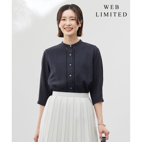 ゆとりのあるサイズ感でこなれた印象に!光沢とスラブの表情感が魅力の、バンドカラーブラウス