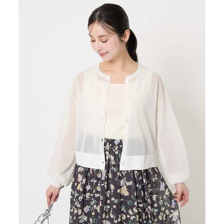 ショート丈のニットカーデはシアーな透け感がトレンド感◎。ゆったりとした身幅とボリュームスリーブがこなれ感のある着こなしに。カーディガンですが、釦を閉めてプルオーバーのように着こなしても素敵です。