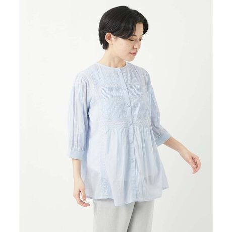 胸元のパーツごとに方向を変えたピンタックと切り替えにラッセルレースを施し透かしをアクセントにしたブラウス。