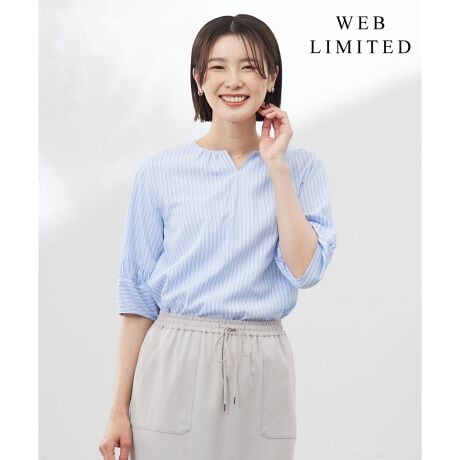 【WEB限定・洗える】ストライプ キーネック ブラウス