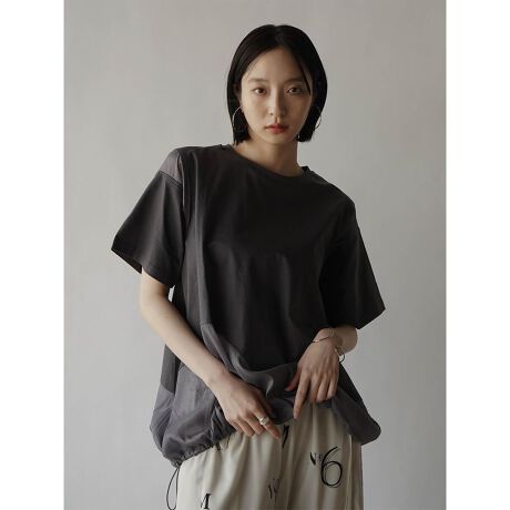 目面の綺麗なカットソーとシャリ感のあるシアー素材を組み合わせたドッキングTシャツ。