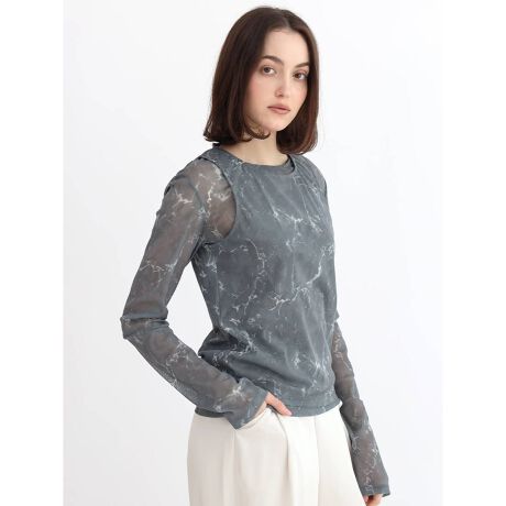 水彩で表現したようなニュアンス柄にほのかなシアー感がどこかモードで大人らしいシアートップス。窮屈感の無い程よいフィット感もポイント。レイヤードデザインになっているので、インナー使いはもちろんプルオーバーとしての着用もお洒落に決まる1着です。