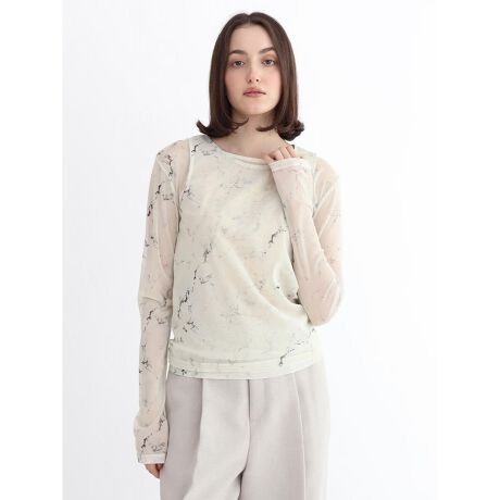 水彩で表現したようなニュアンス柄にほのかなシアー感がどこかモードで大人らしいシアートップス。窮屈感の無い程よいフィット感もポイント。レイヤードデザインになっているので、インナー使いはもちろんプルオーバーとしての着用もお洒落に決まる1着です。