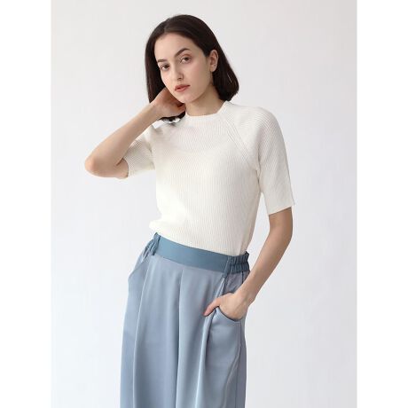 上質な紙ニットを使用し、ソフトな肌当たりと伸縮性を持ち合わせた1着。レーヨン混のさりげない光沢感が大人上品な印象へと導きます。