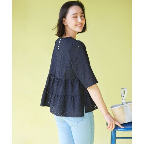 ■デザインフラワーモチーフと幾何柄のレース組み合わせのブラウス。ややハイウエストのギャザーティアードはスタイルアップ見え効果があり、5分丈のパフ袖は着映え間違いなし。やや詰まり気味のクルーネックがカジュアル過ぎず上品に着こなせます。身頃・袖部分はフラワーモチーフのレース、裾ティアードは抜け感のある幾何柄で軽さを出しています。後ろの貝釦がアクセントです。ナローシルエットのボトムやスキニーのパンツとのスタイリングがおすすめです。