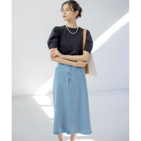 ■デザインシンプルなややナローシルエットのタイトスカートはスタイリングに大活躍間違いなし。組曲オリジナルのシルバーのタックボタンもアクセントになっています。後ろのヨーク切り替えとやや大きめのパッチポケットがスタイルUP効果もあります。裏なし。生地同色のステッチ使いはスタイリングしやすく、さわやかなサックスブルーは幅広くトップスのカラーを受け止めてくれます。