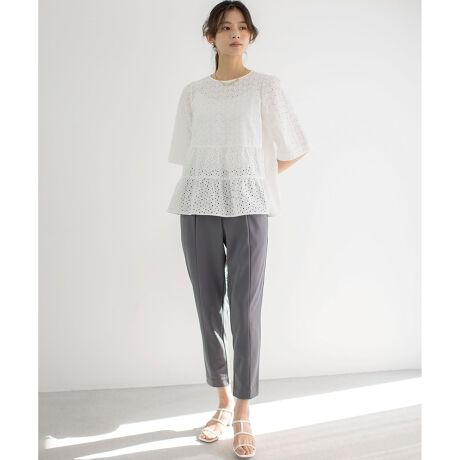 ■デザイン去年大好評のスタイルアップパンツは、素材の良さはそのままで、よりスタイルアップするシルエットに改良しています。リラックス感のあるはき心地ときちんと見えが両立したスッキリ見えのテーパードパンツ。センターに施したデザイン切り替えによる縦長見え効果で、全体的にすっきりとしたデザインに仕上げています。また、切り替えは裏からの細ピンタック使いにすることで縫い代のごわつきや折れ曲がりもなく、肌当たりがよいのが特徴です。ウエスト部分は総ゴム仕立て。前ウエストは見返しにゴムを挟んでいるため、トップスをインしてもスッキリ見えるきれいめデザインです。後ろウエストはゴムの部分にギャザーを入れることでヒップ回りのシルエットを拾わないようにしています。ファスナー無しで気軽ですっきりと着用して頂けるスタイルアップ見えパンツです。