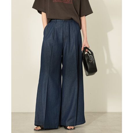 ボリュームのあるワイドシルエットが特徴のデニムパンツ。薄手のデニムを使用しているため、さらりとした生地感で軽く、暑い時季も快適に穿いていただけます。腰回りにタックの入ったすとんとしたシルエットなので、脚のラインを気にせず体型カバーも叶えてくれます。