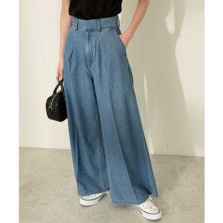 ボリュームのあるワイドシルエットが特徴のデニムパンツ。薄手のデニムを使用しているため、さらりとした生地感で軽く、暑い時季も快適に穿いていただけます。腰回りにタックの入ったすとんとしたシルエットなので、脚のラインを気にせず体型カバーも叶えてくれます。
